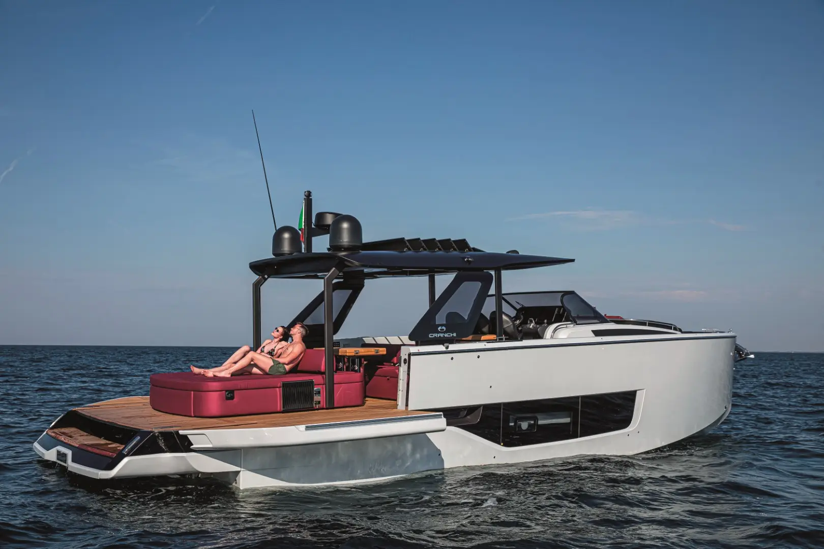 Making it so versatile and appealing are the perfectly designed hull, a deck which appears boundless, and exceptional aesthetic attention to detail. Christian Grande is the artistic director, and has designed a boat with clean, clear lines and a bold character. This character can also be appreciated at the helm: the A46 Luxury Tender gives the feeling of a very agile and soft boat, reactive in turns and with the right amount of power.